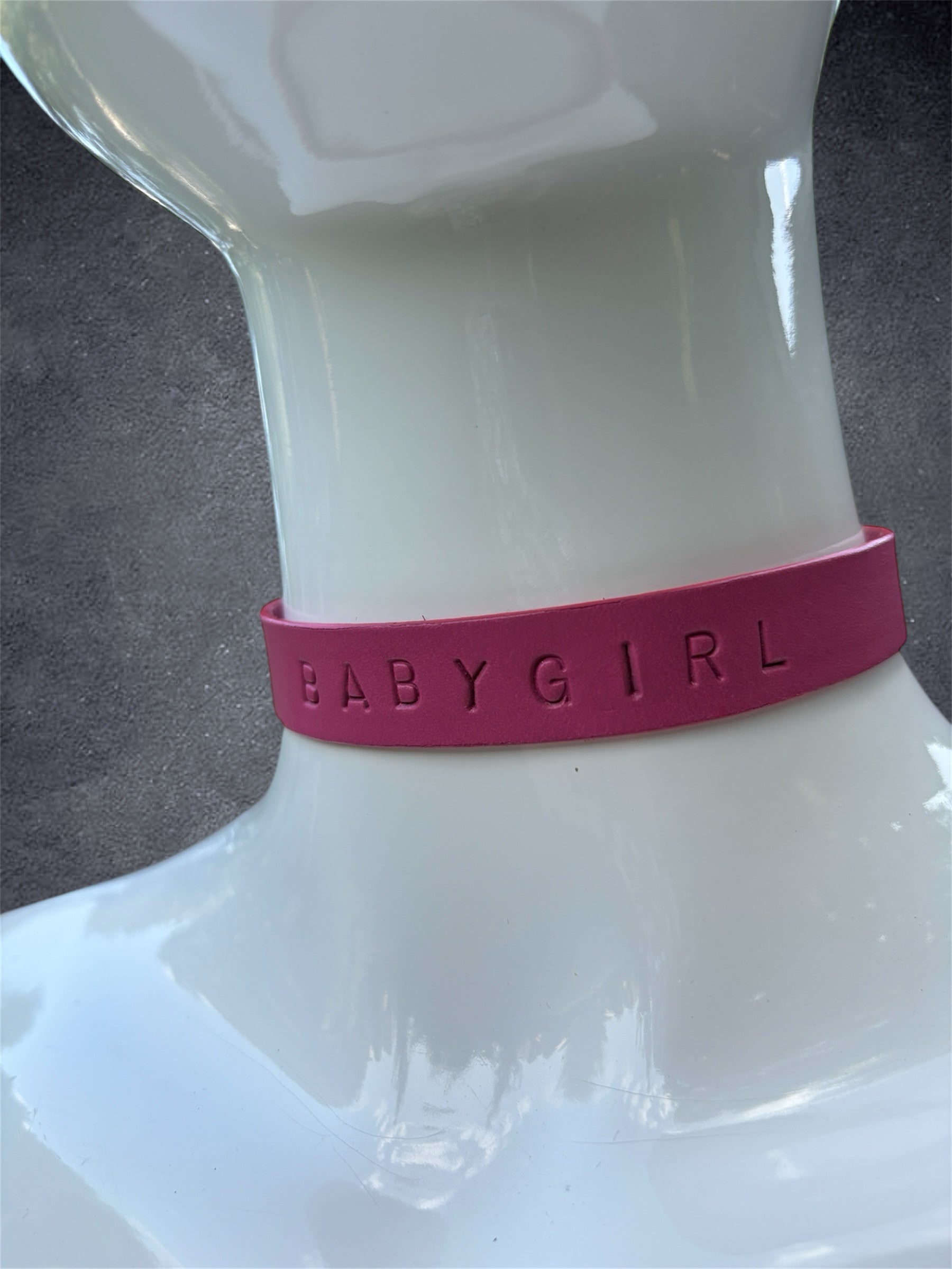 A limited-edition sweetheart. Crafted from a rare soft pink leather, this choker is hand-stamped with the word BABYDOLL—a subtle nod to playful rebellion. The unique leather won’t be restocked, making each piece one-of-a-kind. Delicate yet daring, it’s the perfect finishing touch for any look.