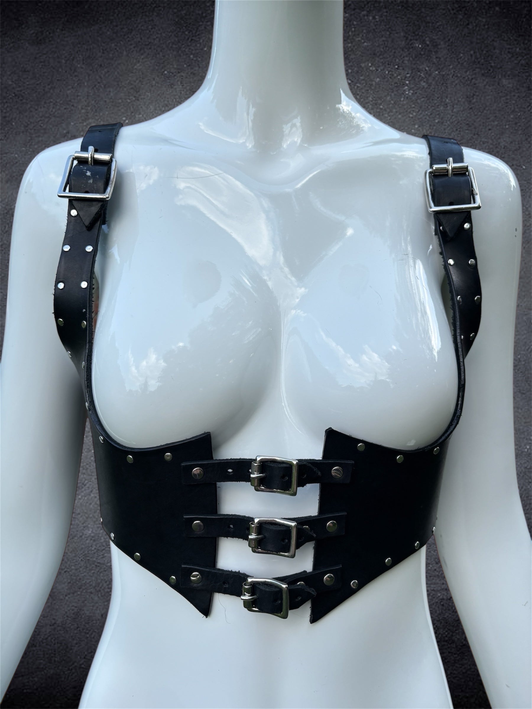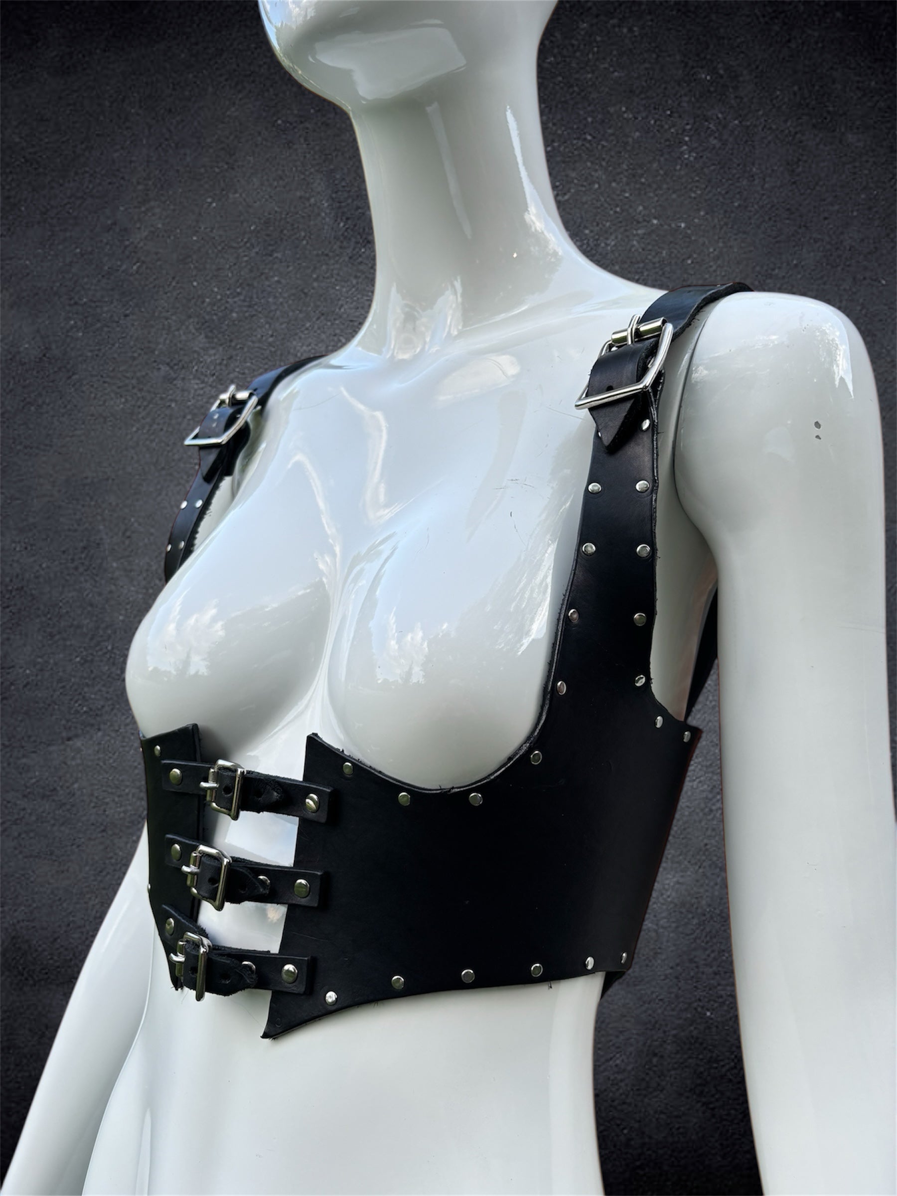 Named after its angular, wing-like silhouette, the Bat Harness makes a fierce statement. Handcrafted from vegetable-tanned leather, this piece is fully riveted along the edges for both durability and drama. Three front-facing buckles cinch the chest, while the pointed cut creates a striking sculptural look. With a more structured feel than our other styles, this harness holds its shape and commands attention. Adjustable straps ensure a secure and comfortable fit.