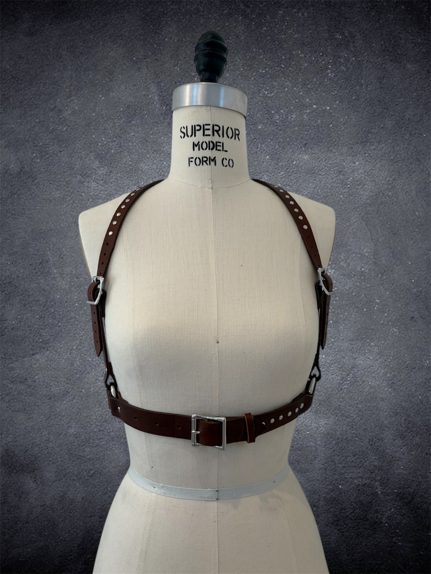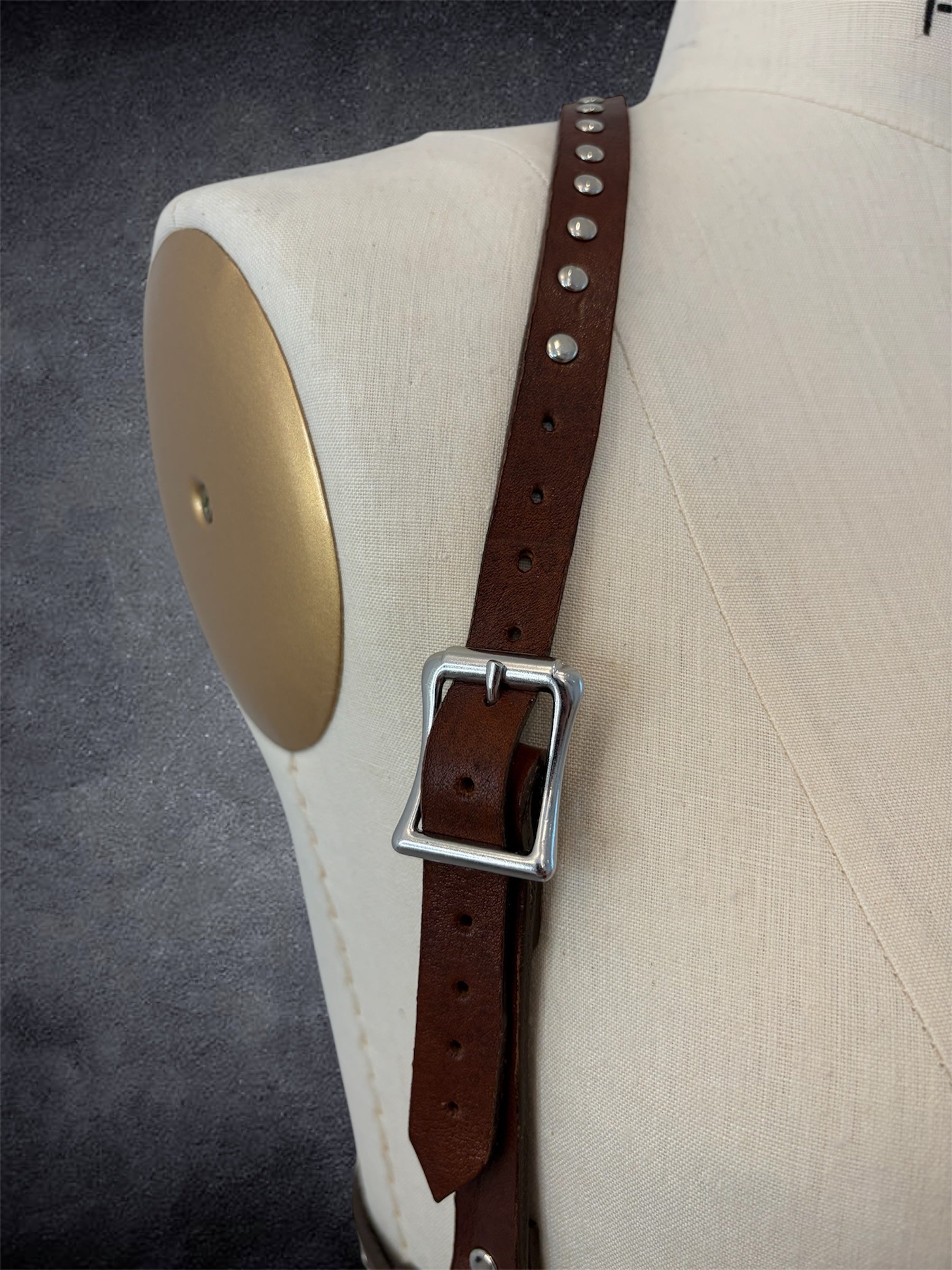 Handcrafted from vegetable tanned leather and finished with nickel hardware and full rivet detailing, this piece is defined by clean lines and minimalistic impact. Designed for versatility, it can be layered or worn on its own. Adjustable straps ensure a precise fit. Perfect for the beginner leather wearer.